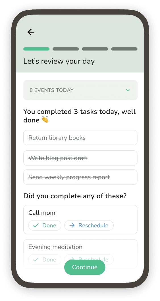 Start your reflection by reviewing what you've accomplished. See your completed tasks alongside your calendar events.