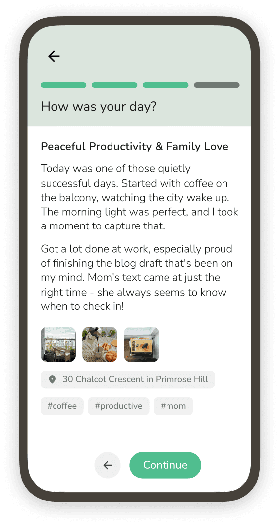 Each journal entry comes to life with photos, mood emojis, and location tags, making it easy to relive your memories.